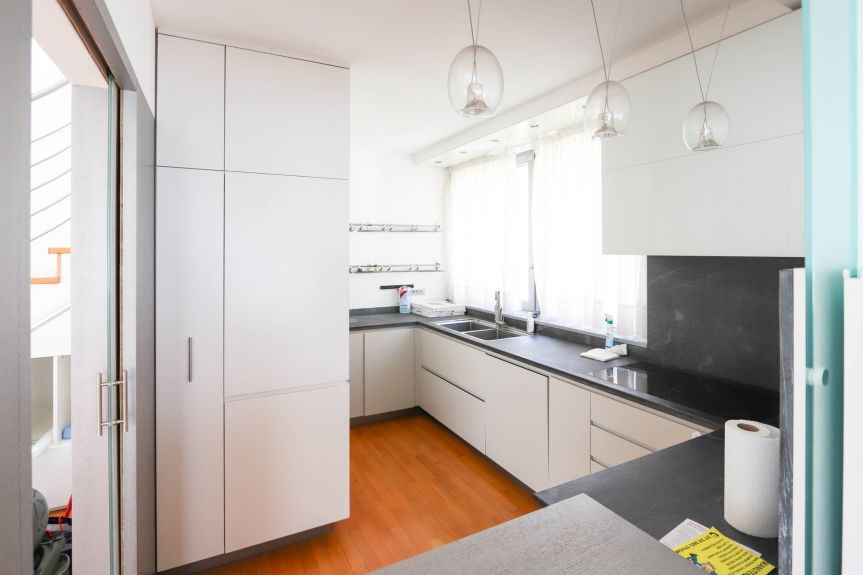 Dieses moderne Penthouse befindet sich im obersten und vierten Stock eines Mehrfamilienhauses und besteht aus einem großen offenen Wohnzimmer, einem großen Balkon, einer Küche und einem Tages-WC im vierten Stock.