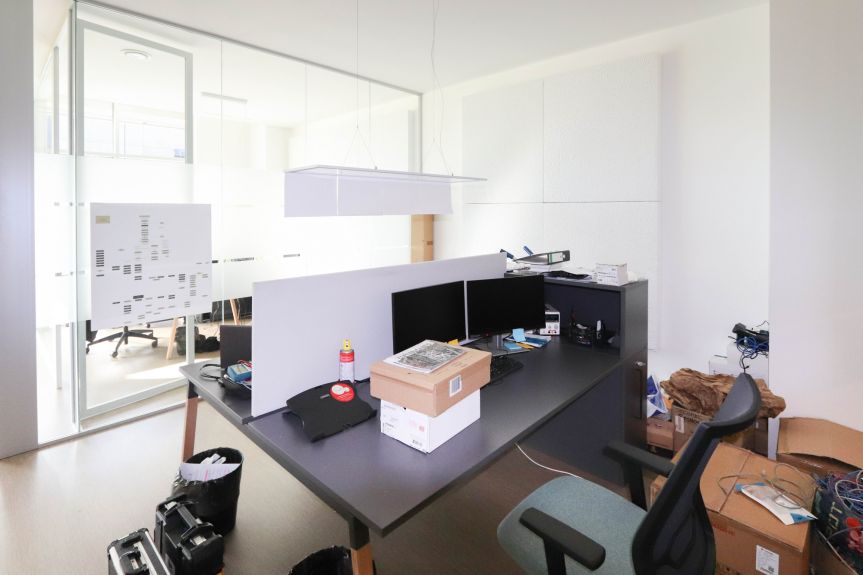 L’arredamento (pareti in vetro nella parte anteriore, cucina, pannelli acustici, moquette nella parte posteriore, tutte le lampade e i mobili) può essere rilevato dall’attuale inquilino al prezzo di € 30.000.